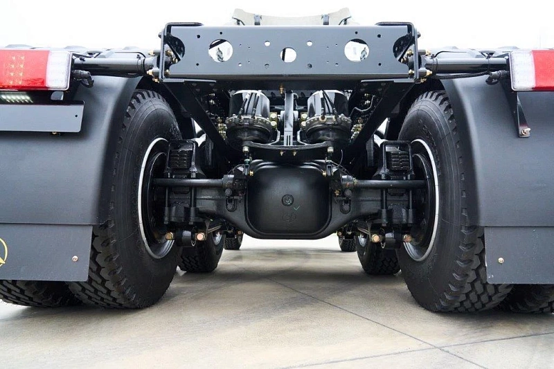- Ведущий мост: Hande Z300, 2 х 13 тонн, I = 4, 266, есть блокировки межосевого и мeжколёсных дифференциалов. Рессоры. Бортовые редукторы.